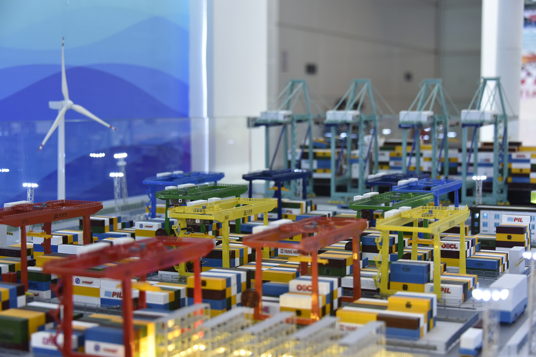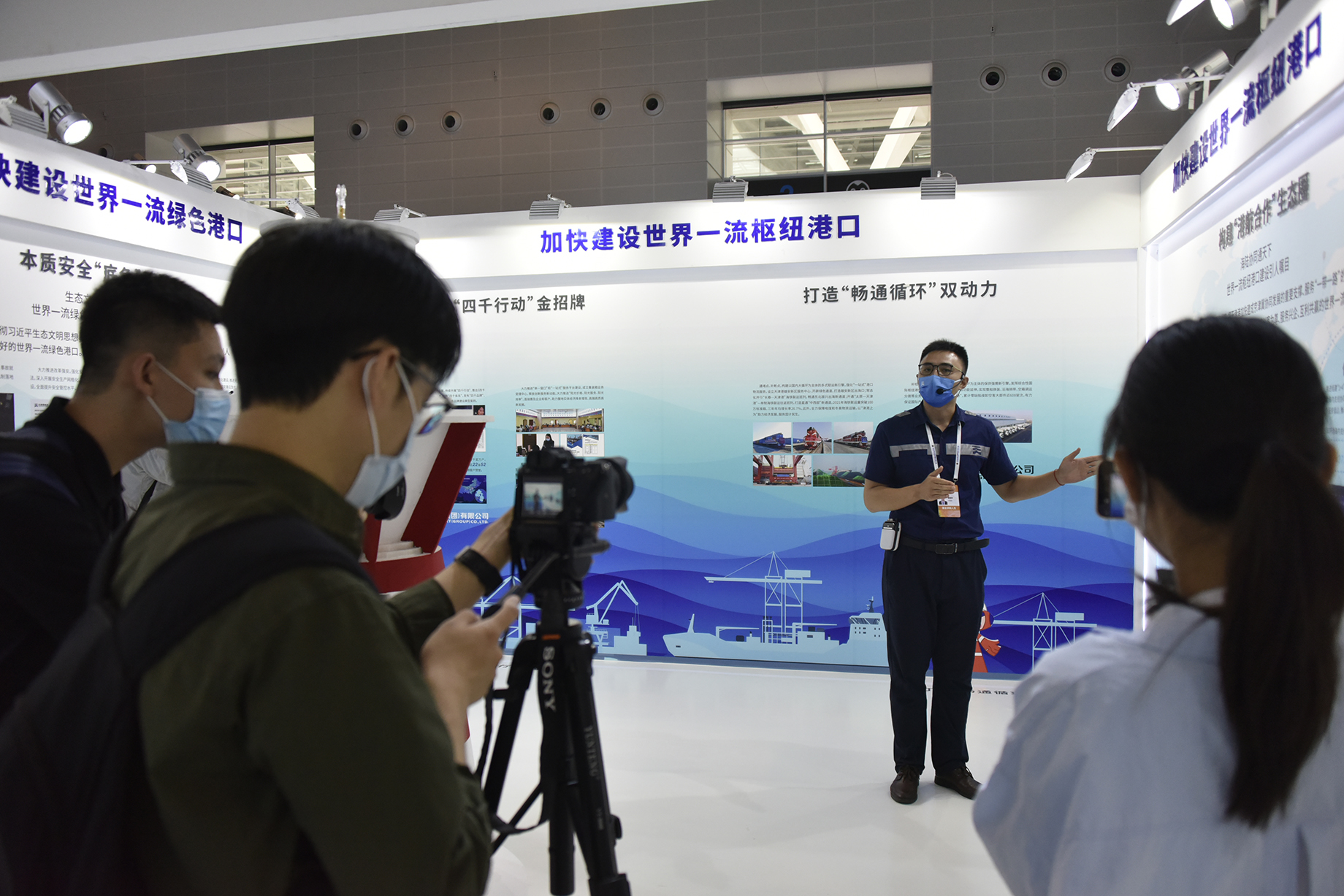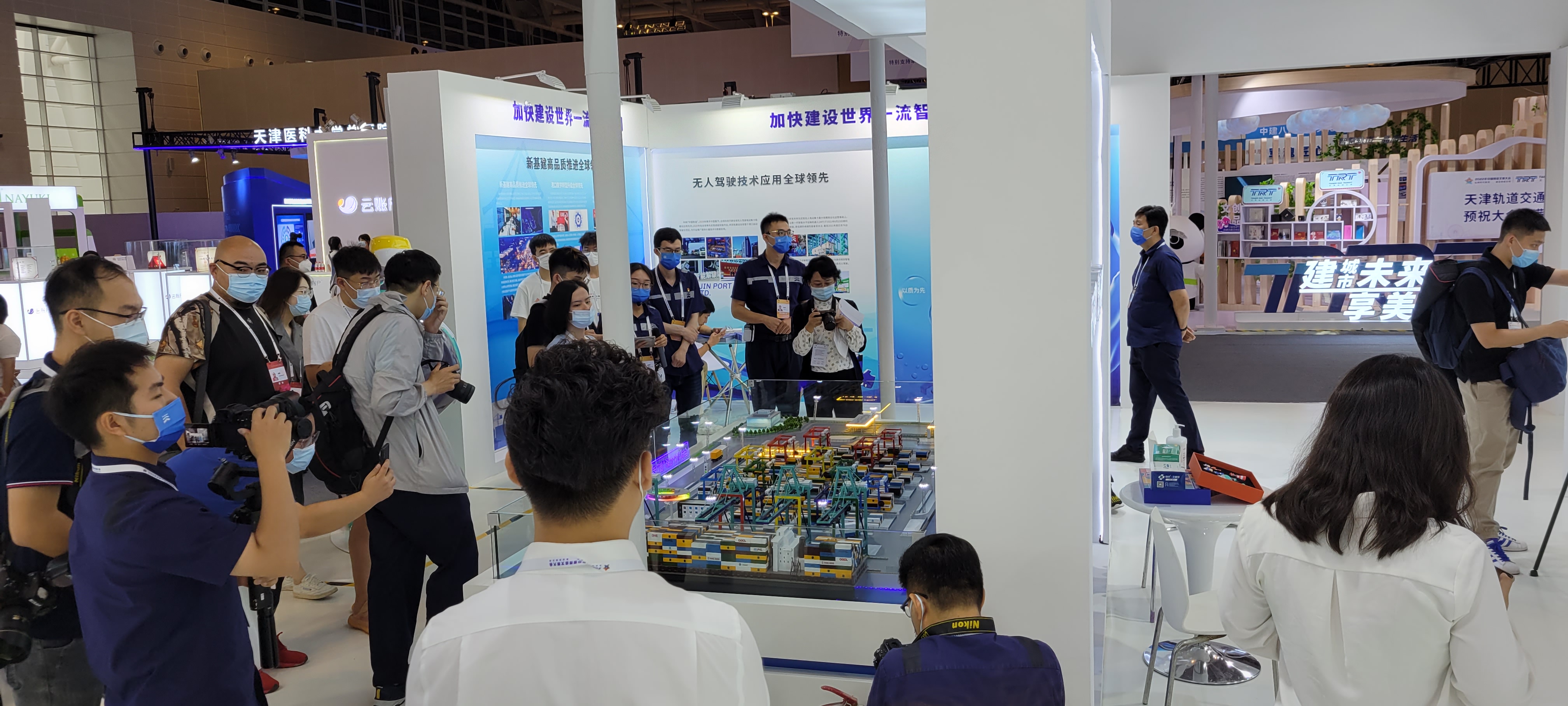绿色港口展区,通过安全管理提升、环境改善治理、疫情防控责任、绿色运输变革等内容,展现着6T体育 贯彻落实习近平生态文明思想,践行绿色发展理念,全面构建本质安全绿色发展模式,扎实推进绿色港口建设,逐步建设“零碳港区”“零碳港口”;智慧港口展区,“七彩智港”全景式互动沙盘让观众驻足流连,“无人码头”生产作业场景全流程真实呈现。自动化岸桥精准起吊,智能水平运输机器人自动行驶,自动化轨道桥运转不停,两台风电设备稳定运行,以全新模式引领世界港口智能化升级和低碳发展;枢纽港口展区,展示着天津港深化港航协同、积极服务双循环,深入开展“四千行动”等方面取得的显著成果。天津港充分发挥国家重要战略资源作用,深度融入以国内大循环为主体、国内国际双循环相互促进的新发展格局,向世界一流枢纽港口大步迈进。